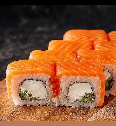 Состав: Рис экстра-класса , свежайший и вкуснейший лосось, нежнейший сыр, огурец, нори + талант нашего шефа