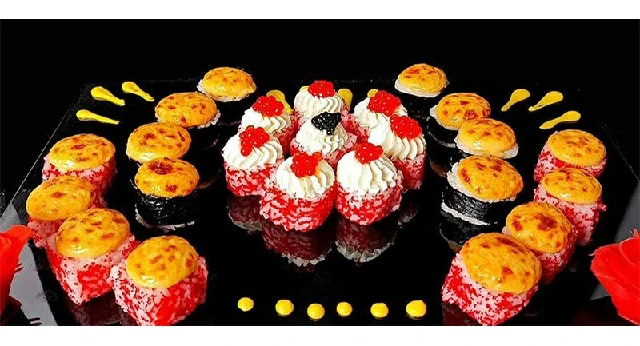 Состав: Калифорния гриль 8 штук Сливочный лосось с тобикой 8 штук Вулкан 8 штук
