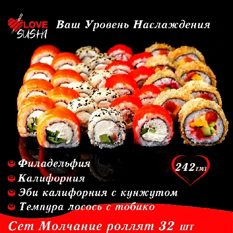 Состав: Филадельфия Калифорния Эби Калифорния с кунжутом Темпура лосось с тобикой