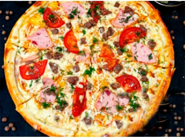 Тесто, соус, сыр, помидор, укроп, ветчина, говядина
