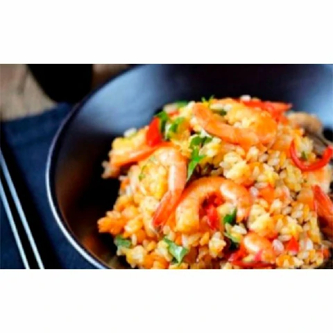 Рис, морепродукты, морковь, капуста, паприка, лук репчатый, чеснок, соус терияки, яйцо, масло, лук зелёный, кунжут