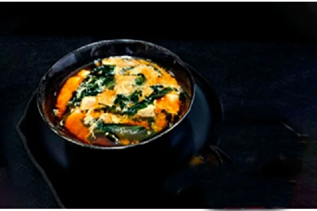 Рыбный бульон, мисо паста, водоросли вакаме, сыр тофу, яйцо, соус ширачи, кинза